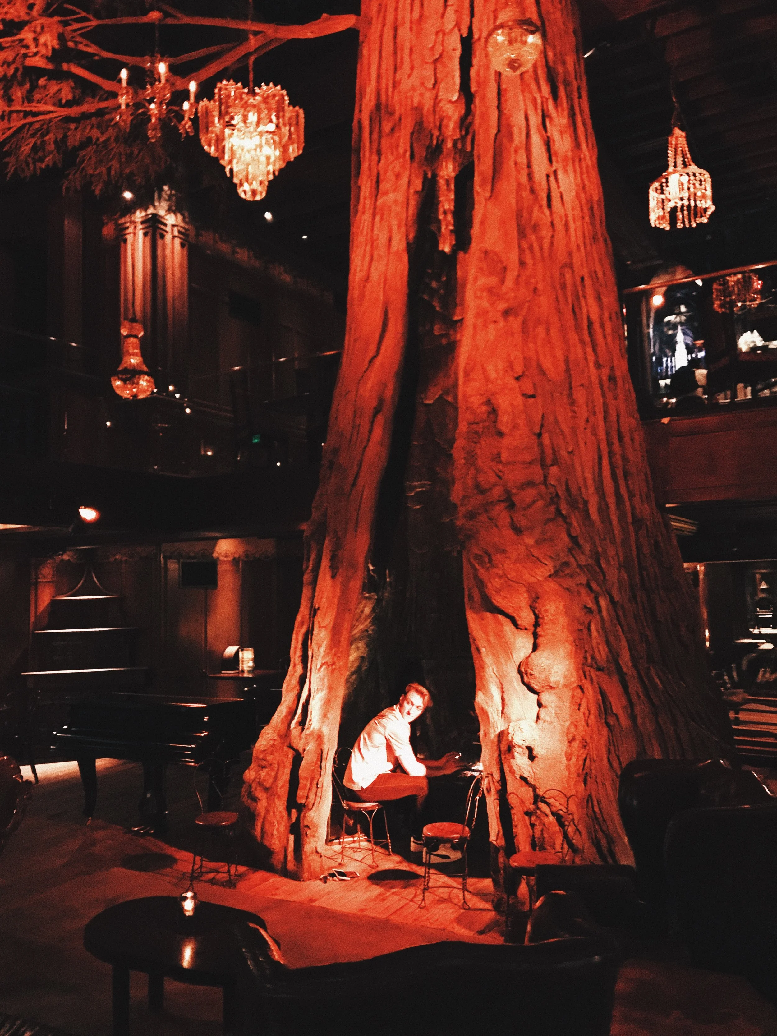 After watching the sunset, we decided we needed to grab some food. Alex and I walked a couple blocks to a quirky place called Clifton's Republic. Clifton's is a kitschy and eclectic spot that transports you to the middle of a dimly lit Redwood forest. It is full of fake trees, taxidermy and old Victorian furniture. Somehow it all works together in a charming way. It has four floors, with a soul food cafeteria on the first, and then 3 unique bars on each upper level. Highlights were the HUGE chandelier tree and the hidden glass mirror door that leads to a secret Tiki Bar. Definitely a fun place to explore.